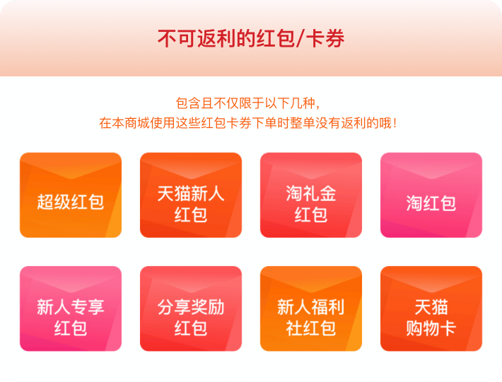 注意:不计入返现计算的部分包含但不限于:税费、运费、优惠券、抵价券、虚拟抵价物(淘金币/淘礼金等)、电子兑换券